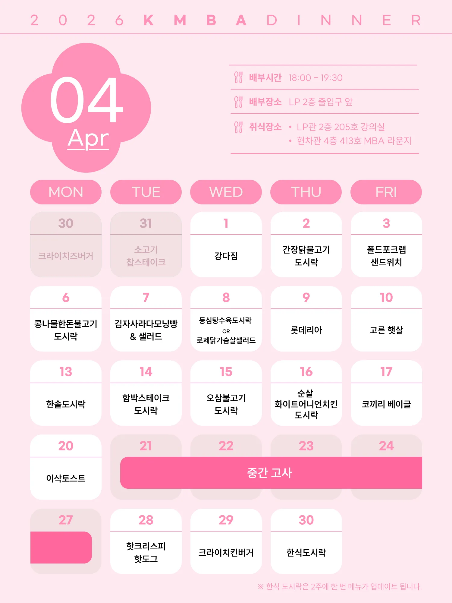 월간 석식 일정은 전월 말일에 업로드 됩니다.